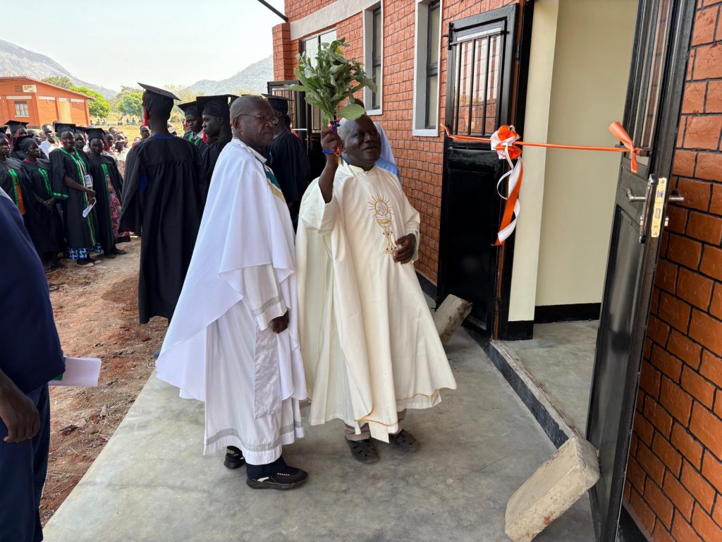 Am Ende des Gottesdienstes setzen wir uns in Bewegung, um dabei zu sein, wenn Father Felix die neuen Gebäude segnet – und wir haben eine ganze Menge davon. Zunächst geht es zum neuen Technology-Block, dann zum Sanitärbereich für das Personal – dass daran noch gearbeitet wird, ist eine Messungenauigkeit, dann ist das neue Einfahrtstor dran und am Schluss die Küche. Wenn man es ganz genau nimmt, wurde die Küche schon bei der Eröffnung am Unabhängigkeitstag gesegnet, aber durch die neue Biogasanlage geht das durchaus noch einmal. Bei jeder Station gibt es neben Segensworten und Weihwasser vom Priester auch eine sichtbare Eröffnung mit Durchschneiden eines Bands, was jeweils von jemanden von uns als Sponsor, einem Vertreter der Schule und Julias, dem Vater von Emmanuel, von dessen Familie wir den Grund bekommen haben, vorgenommen wird.