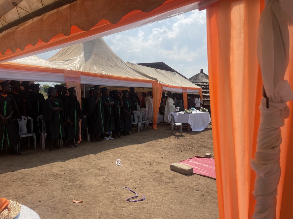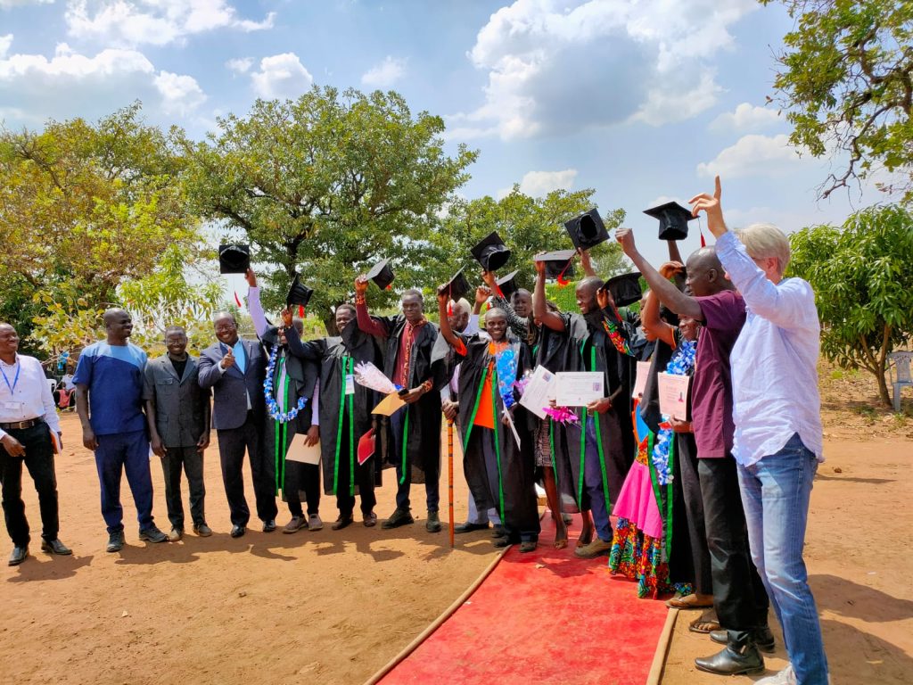 Nach Abschluss des Gottesdiensts ergreift der Schulleiter das Wort, begrüßt alle Gäste und hält noch eine lange Rede, von der wir wiederum kaum etwas verstehen. Dann geht es los mit der Zeugnisverleihung. Da die formale zweijährige Ausbildung, die im letzten Jahr gestartet wurde, nun erst bei der Hälfte angekommen ist, erhalten an diesem Tag die gut vierzig DIT-Studentinnen und Studenten ihre Zeugnisse. Sie sind in feierliche Roben eingekleidet worden, so wie man es bei uns von Bachelor-Feiern kennt. Viele haben Verwandtschaft dabei und insbesondere bei den jungen Frauen gibt es bei jedem Namen, der aufgerufen wird, einen Jubelsturm der dem nahe kommt, wenn in einem Champions League-Spiel das entscheidende Tor geschossen wird.