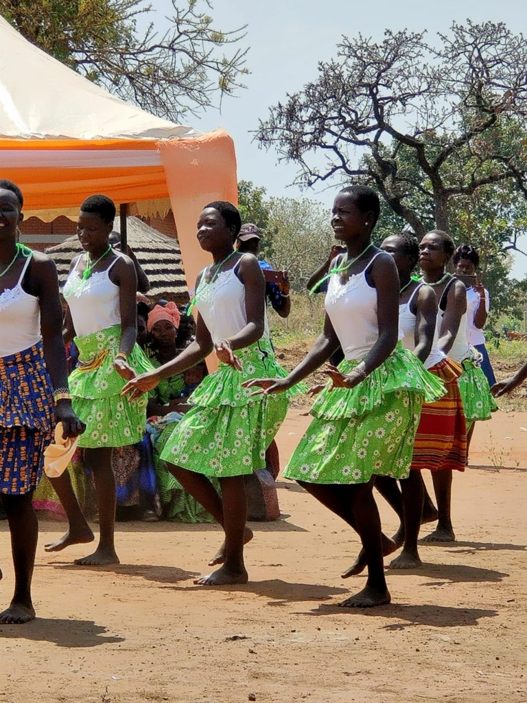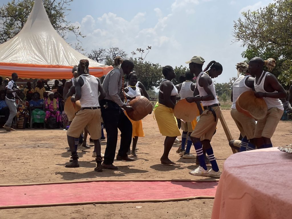 Es ist inzwischen halb zwei, wir haben langsam Hunger und es ist heiß. Vor dem Mittagessen müssen aber noch Reden gehalten werden. Das macht auch viel Sinn, weil – wie Berna mir erklärt – die Leute hören sich das alles sehr geduldig an, wenn sie wissen, dass es danach Essen gibt. Aber es zieht sich. Makhmot, der Bruder von Berna, der ein zweites Mal ins Parlament von Uganda gewählt werden möchte, muss reden, die für Adilang zuständige Vertreterin des Distrikts Honorable Berna redet sehr lange, der Bürgermeister muss reden, der stellvertretende Leiter der Lehrerschaft im Distrikt darf nicht fehlen, und natürlich muss auch Emmanuel etwas sagen. Im Rahmen seines Auftritts stellen sich alle Mitglieder von Dongo Paco vor und auch wir müssen uns in die Mitte stellen und jeder von uns muss ein paar Worte sagen. Wie wir denken, es ist überstanden, kommt noch der Guest of Honor dran. Dabei handelt es sich interessanterweise um einen hochrangigen Vertreter des Distrikts Gulu, der vor zwei Jahren noch Lehrer an unserer Berufsschule war. Spaßeshalber sage ich zu Robert, die finden bestimmt noch einen Redner und schon steht noch einmal jemand in der Mitte, dessen Funktion ich nicht genau verstehe und auch er muss noch einiges von sich geben.