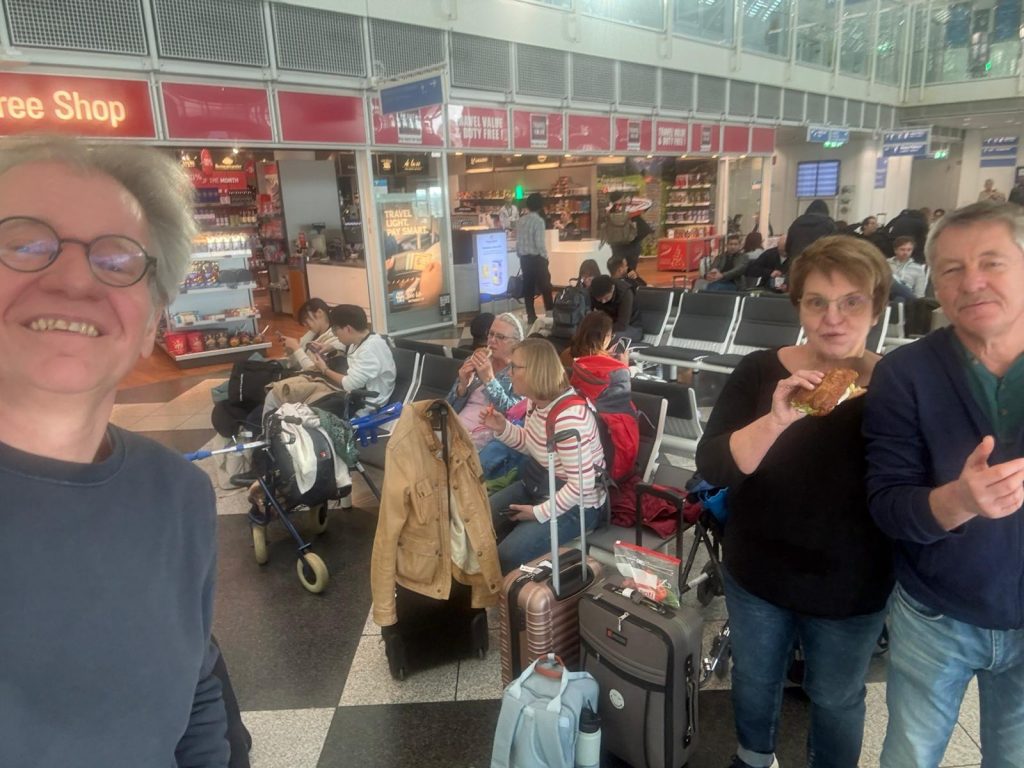 Elisabeth kommt aus Hebertsfelden, Robert aus Riemerling, beide auch mit jeweils zwei Koffern und ausgiebig Handgepäck. Beim Einchecken geht das meiste problemlos durch, nur bei Elisabeth wird der zweite Rucksack nicht als Handtasche akzeptiert. Wir verteilen Rucksack samt Inhalt auf alle anderen und kommen damit durch. Heike fährt mit dem Rollator und den Krücken am Gate vor, ich trage den schweren Buggy und wir gehen davon aus, dass wir Rollator und Buggy beim Einsteigen vor der Flugzeugtür ablegen können und beim Aussteigen wieder bekommen. So einfach ist das aber nicht, sondern am Gate muss alles verpackt und mit Gepäckanhängern versehen werden. Das Personal ist zunächst etwas irritiert, dass dies nicht bereits beim Einchecken geschehen ist, aber sie sind dann auch sehr hilfsbereit und zu unserer großen Freude wird alles gleich mit Ziel Entebbe eingeladen, sodass Heike nur die Krücken selbst transportiert.