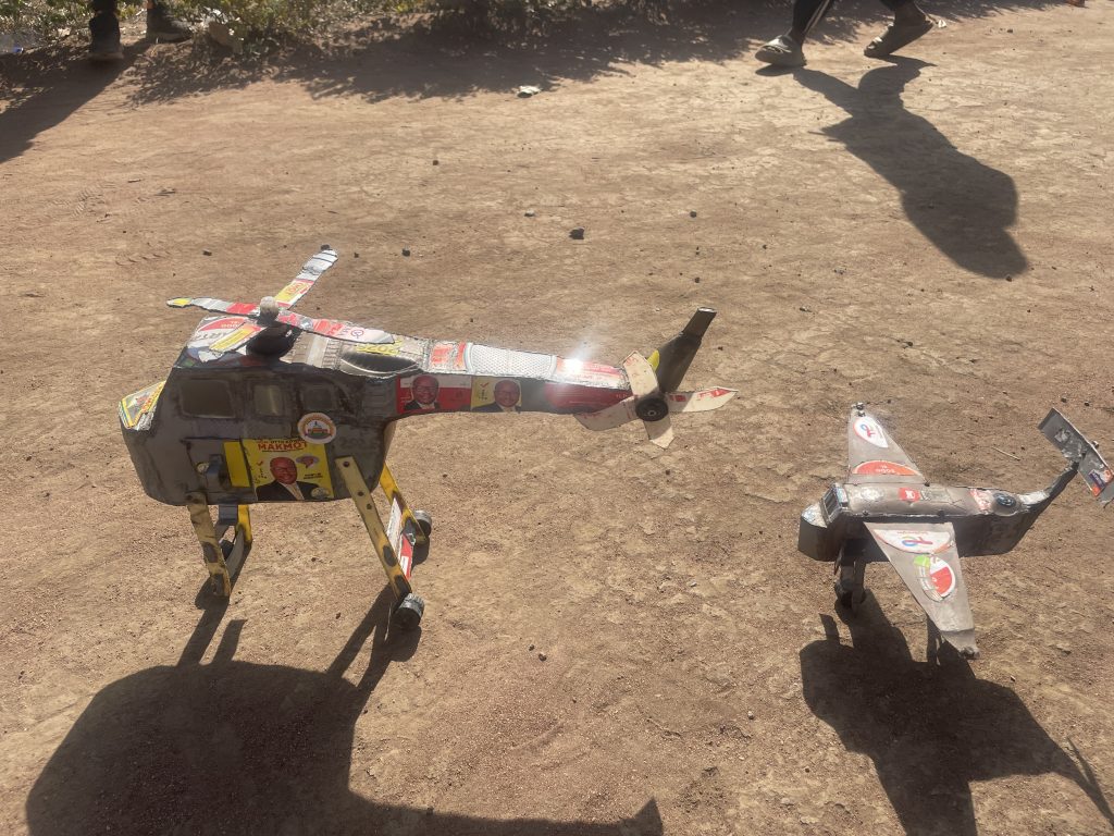 Ein Highlight ist der Wettbewerb für die Bastler. Es gibt einige aus Draht gebastelte Spielzeugautos, die nicht nur geschoben, sondern auch gelenkt werden können. Eine ganz andere Liga ist ein junger Mann, der zwei Hubschrauber gebastelt hat, die blinkende Lichter und drehende Rotoren haben und im Kreis fahren. Einer ist ein Geschenk für den gerade gewählten Abgeordneten Makhmot, damit er hin und her fliegen kann. Nett ist auch ein gebastelter Fahrradfahrer, der beim Schieben die Pedale tritt, den ich ihm abkaufe, weil er so toll gemacht ist. Mal sehen, wie ich ihn zurück nach Deutschland bekomme.