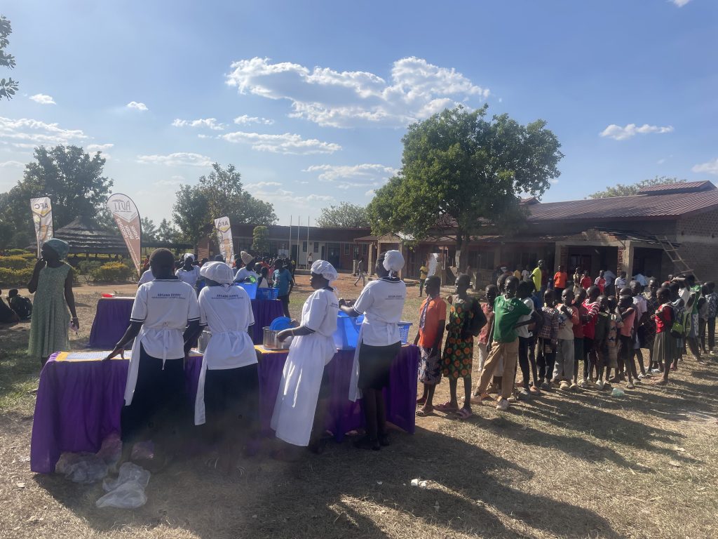Um drei Uhr gibt es für alle Mittagessen. Das hört sich harmlos an, aber 800 Kinder zu verköstigen, ist eine große Herausforderung. Ein ganzes Rind ist die Grundlage für riesige Mengen Eintopf, die notwendig sind, um für jeden einzelnen in der Warteschlange, die sich über das ganze Gelände quer über den Sportplatz zieht, etwas zu haben.