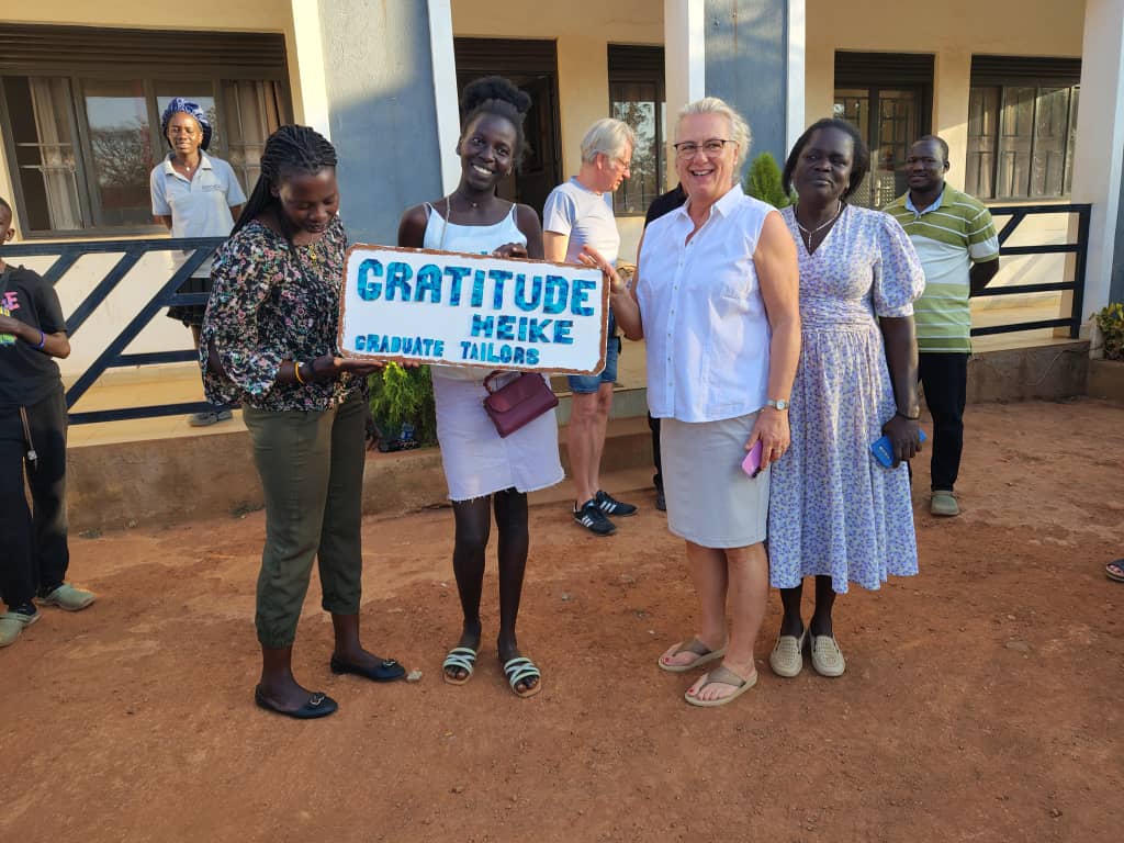Vivian, Francis und Pius sind gekommen, um uns Lebewohl zu sagen. Petra bringt ein Kleid für Heike und ein Hemd für mich als Geschenke aus der Schneiderei und wir bekommen auch ein Hemd, das wir für jemanden aus München bestellt haben und bezahlen. Für Heike haben die Schneiderinnen als besondere Überraschung noch ein Schild mit einer Dankesbotschaft gebastelt.