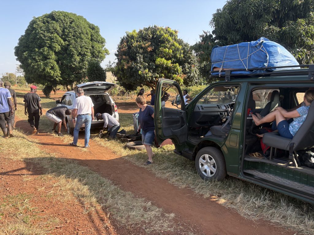 Das ist natürlich sehr unangenehm. Das Auto hat ein Notrad im Kofferraum, also laden wir alles aus, um an das Rad zu kommen, und Tony und Emmanuel wechseln den Reifen. Nach gut einer halben Stunde ist alles wieder eingeladen und wir können weiterfahren. Zeitlich gesehen ging das eigentlich ganz gut.