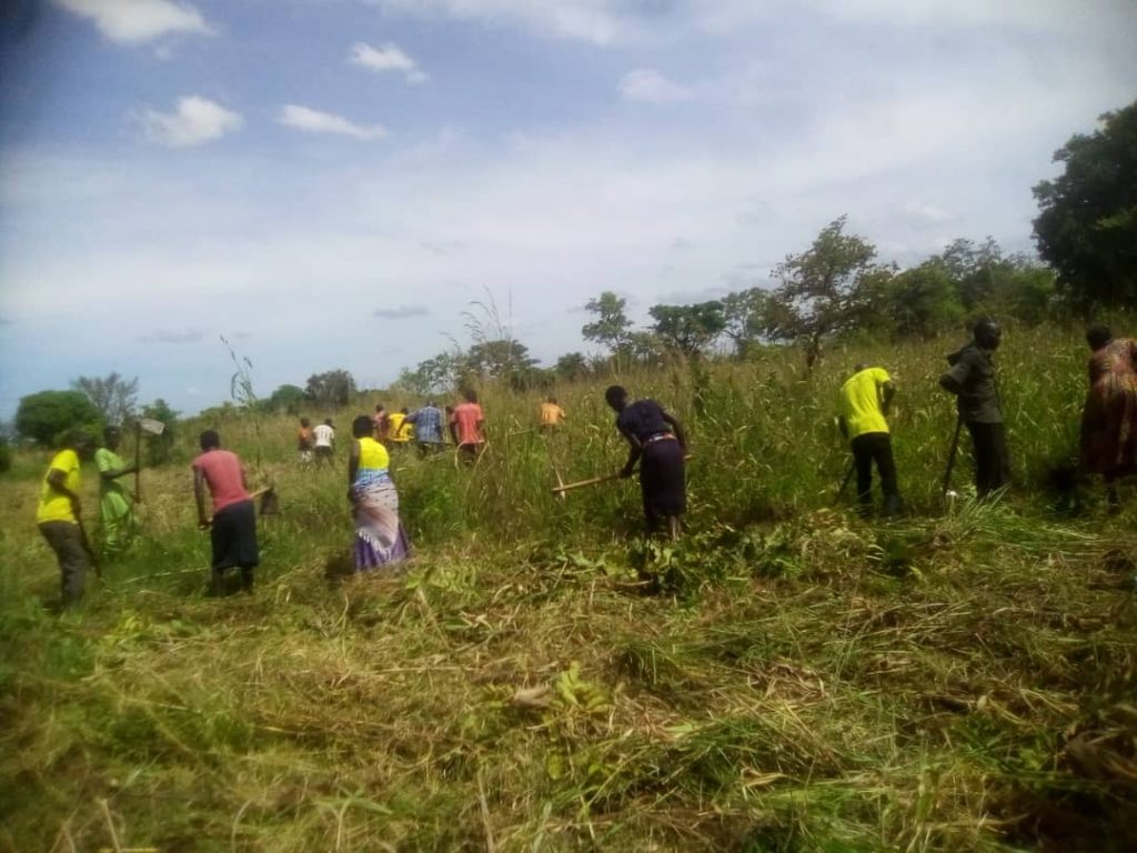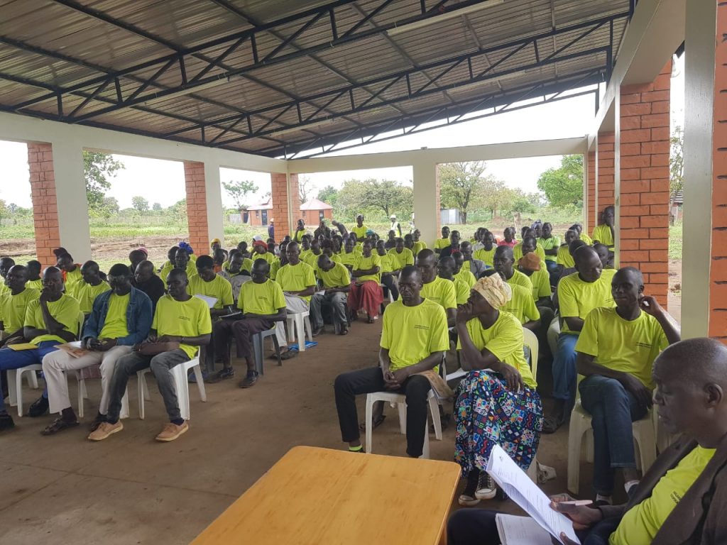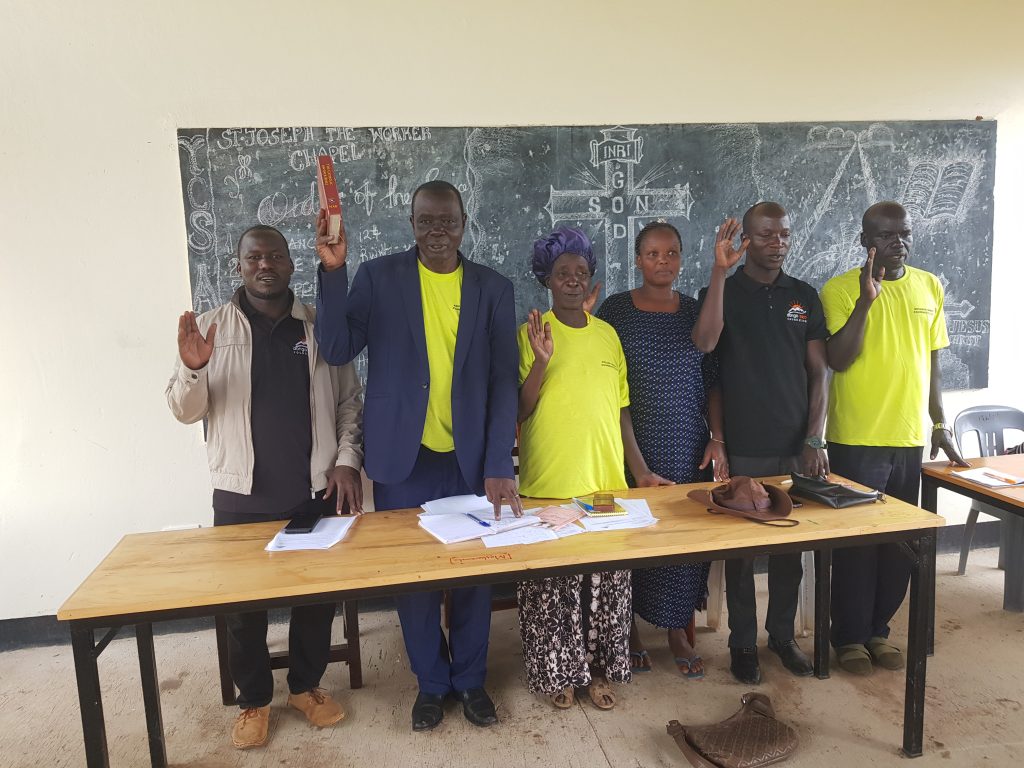 Das zunächst nur vorläufig gewählte Präsidium wurde bestätigt und vereidigt. Chairman ist der pensionierte Tierarzt Dr. Okot Richard Bodo, der selbst viel Land bewirtschaftet und in der Gemeinde hohes Ansehen genießt. Wir sind sehr froh, ihn in dieser Rolle zu haben. Auf dem Bild ist er der zweite von links.